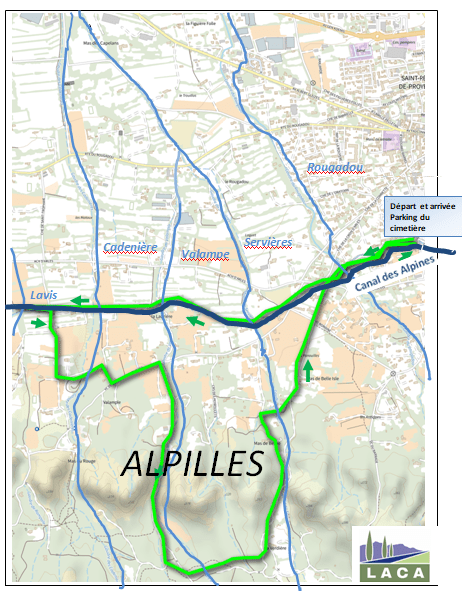 Départ au parking du cimetière de St-Rémy. Suivez le canal vers l’ouest . Vous croiserez 5 gaudres (voir « petit vocabulaire ») qui sont représentés sur la carte. Au bout de 2,5 km tourner vers la gauche sur le chemin Ste Trophine. Suivez cette route jusqu’à qu’ ‘elle rencontre la rue Servières et Cadenières. Suivez cette route vers la gauche jusqu’aux panneaux « Valemple » et « mur d’escalade ». Suivez cette direction le long du gaudre de Valemple. Dépassez le mur d’escalade. A une fourche prendre à gauche, puis le premier sentier vers la gauche, montez jusqu’à un petit col. Prenez le 3ème sentier sur la gauche qui descend le long de la vallée après le col . Suivez le chemin puis la route jusqu’au canal et prenez le vers la droite.
