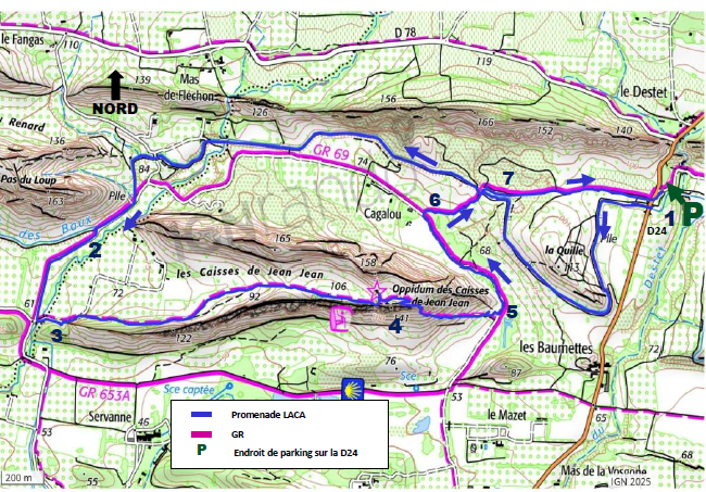 Après l’oppidum 4 ,suivez le petit sentier qui descend, puis une fois en bas, 5 suivez le grand sentier à gauche. Juste avant un mas fraichement restauré (le mas de Cagalou) 6 , tournez sur le petit sentier sur votre droite. Lorsque vous aurez franchi le canal, 7 prenez le sentier sur votre droite (vous suivrez le canal que vous avez déjà pris à l’aller, en sens inverse), puis quittez le canal en suivant votre sentier tout droit jusqu’à la D24 et votre place de stationnement.