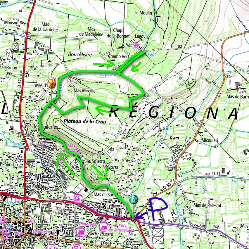 La promenade débute aux chutes sur la route de Cavaillon, en venant de St-Rémy prendre le sentier qui longe le canal à gauche de la route. Suivre le canal sur le pont-bâche qui surplombe un rond-point. A votre gauche le canal se divise, une partie de l’eau part vers la branche de Noves. Votre sentier continue sur la branche d’Eyragues et chemine jusqu’au château de Lagoy. Traverser le pont et après quelques centaines de mètres sur l’autre rive du canal, partir sur la gauche dans les vignes, et suivre le circuit sur la Crau indiqué sur la carte. Rejoindre ainsi le canal.