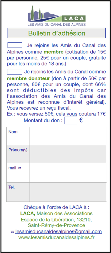 Devenez membre de l’Association des Amis du Canal des Alpines (LACA) N.B. Pour don à partir de 50€/personne, vous recevrez un reçu fiscal par mail Contact: lesamisducanaldesalpines@gmail.com