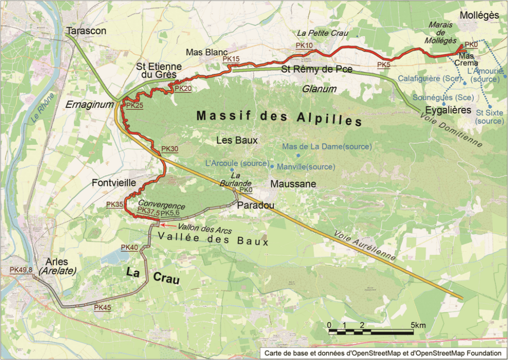 Autour de la petite chaîne des Alpilles, les plus anciens aménagements remontent aux Romains qui ont laissé des monuments témoins de leur génie de bâtisseurs. On peut toujours voir, des vestiges d’un aqueduc, construit aux Ier et IIème siècles , qui collectait l’eau autour des Alpilles pour alimenter des moulins à blé et apporter de l’eau à Arelate (Arles) en toutes saisons. Le vestige le plus emblématique est le pont-aqueduc de Barbegal qui permet de traverser le Vallon des Arcs, au point de convergence de la branche nord et sud de l’aqueduc.