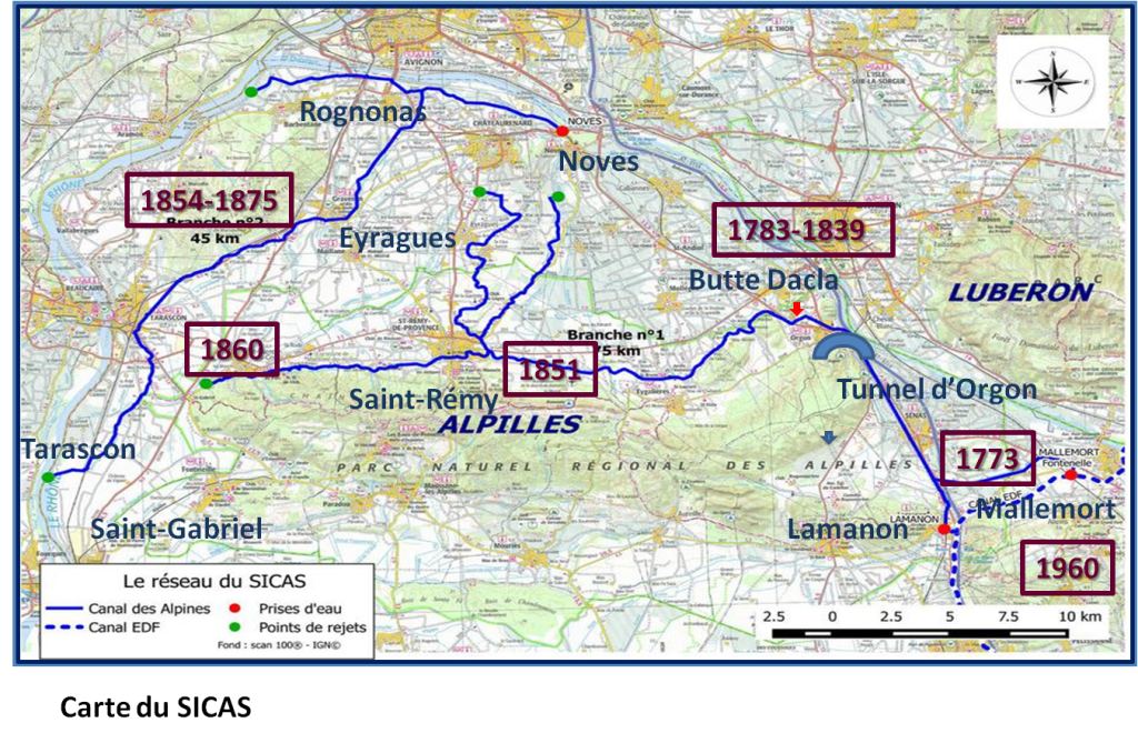 Enfin la construction est prise en main enfin par une société sérieuse, la compagnie de Victor Courtet de l’Isle, qui termine la branche de St-Rémy-de-Provence en 1860. Une autre branche plus au nord, dite de Rognonas, est construite par la même compagnie entre 1854 et 1875. La construction du canal des Alpines aura duré un siècle !